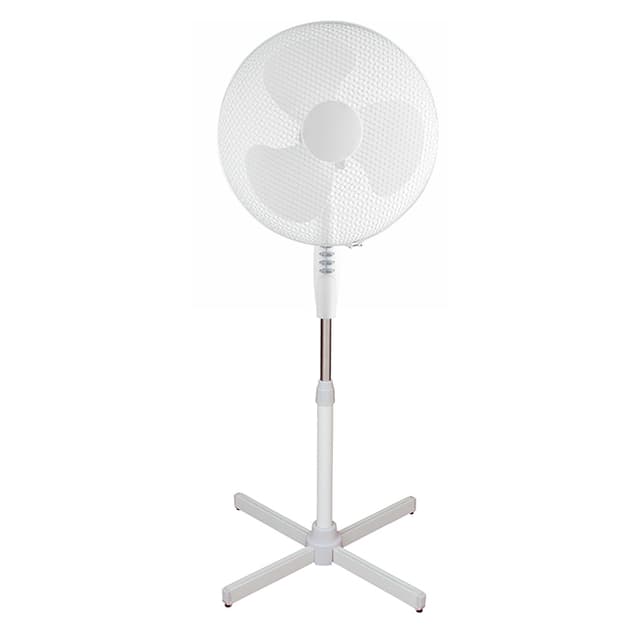 Stillegående gulvvifte med rotering til sidene. Rotering kan låses til et fast sted og viften kan vinkles i høyden. Justerbar teleskopfot: 105 - 125 cm. 3 hastigheter. 50 watt. Str: 42 x 125 x 50 cm. Ce og rohs godkjent.