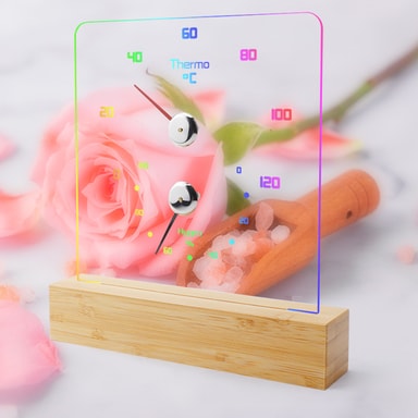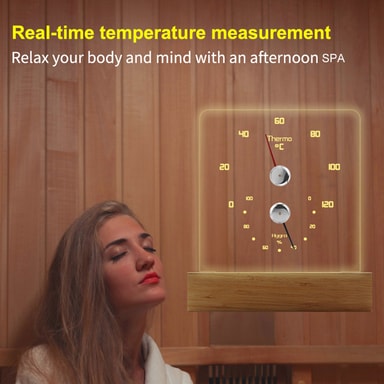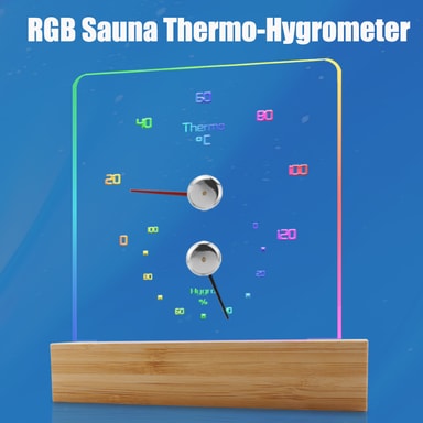 Ambient Lighting: Utstyrt med RGB LED-lys, tilbyr dette termometeret tilpassbar omgivelsesbelysning for å forbedre atmosfæren i badstuen din. Velg mellom ulike fargemoduser, inkludert en flytende regnbueeffekt, en fargebåndovergang, en 7-fargers syklus eller individuelle farger.