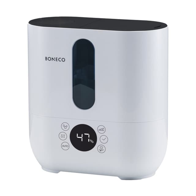 Boneco U350 ultrasonisk luftfukter oppfyller alle behov. Den er veldig brukervennlig, og har fått Red Dot Design Award (et internasjonalt anerkjent kvalitetsmerke for fremragende design). Luftfukteren kan fylles med vann fra toppen, og styres ved hjelp av LED-skjermen. I ""AUTO"" -modus fuktes romluften til en relativ relativ fuktighet på 50% automatisk. Luftfuktigheten måles ved hjelp av en innebygd fuktsensor, og kan stilles inn etter ønske. Displayet gir en oversikt over alle funksjoner og vedlikeholdsinstruksjoner. Boneco U350 tilbyr forfriskning med en kjøletåke om sommeren og en behagelig varm tåke om vinteren. Essensielle oljer kan også brukes til romduft om du ønsker det.