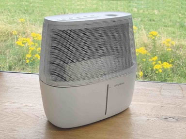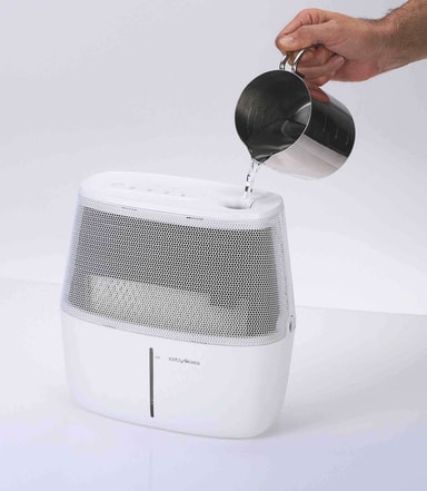 Fyll vann i beholderen. Filtermaterialet er porøst og suger fuktigheten opp fra vannet. Luft blåses gjennom filteret, og luften tar til seg fuktighet.