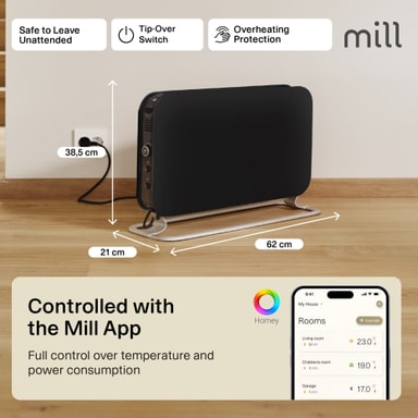 Mill Wi-Fi gulvvarmer CO1200WIFI3BLACK er en elegant, bærbar varmeovn som er designet for å varme opp rommet ditt effektivt. Med en effekt på 1200 W er den perfekt for rom på opptil18 m². Koble den til Mill-appen for personlig temperaturkontroll og nyt en koselig atmosfære året rundt.