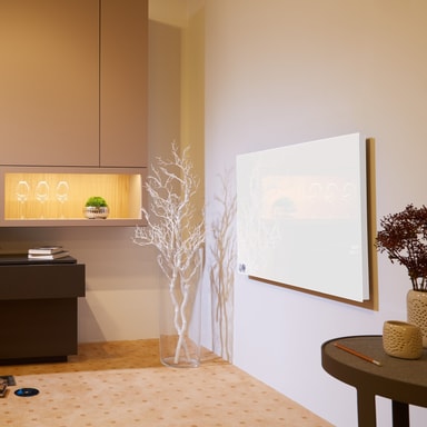 Den subtile forskjellen: I motsetning til konvensjonelle radiatorer varmes infrarøde varmeovner (primær stråling) opp veggene i stedet for luften i et rom. Vegger lagrer varmen lenger enn luftburet og returnerer varmen til rommet. (Sekundær stråling) Murverket forblir tørt. Fuktighet og mugg står ikke en sjanse.
