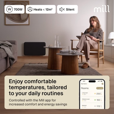 Mill Invisible Smart Wi-Fi Gen4 panelovn PA700WIFI4BLACK er kompakt og varmer opp rom på opptil 12m2. Panelovnen har en elektronisk termostat og kan trygt brukes i våtrom. For forbedret kontroll, koble den til Mill Wi-Fi-appen.Les mer om produktet
