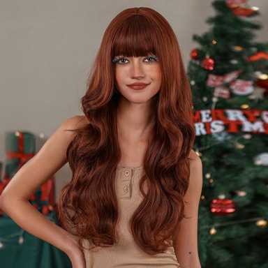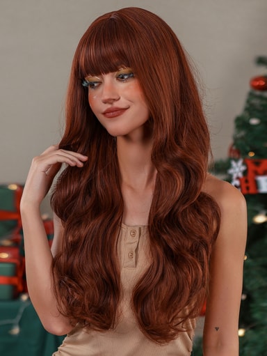 Julebølget langt krøllete hår med smell hår parykker Brun