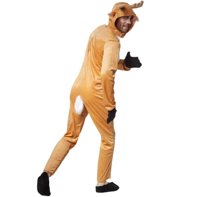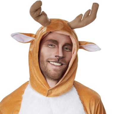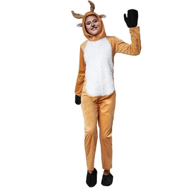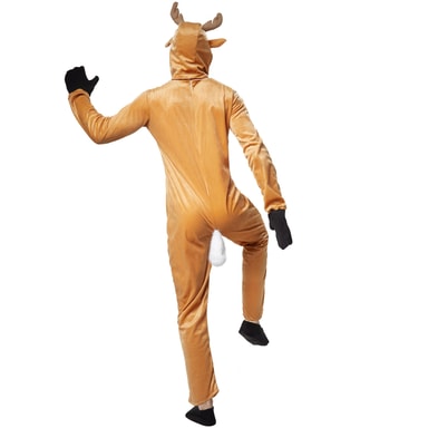 Unisexkostymet kvikt reinsdyr består av en kjeledress, en hette, hansker og sko. Kostymet er fremstilt av okerfarget plysjstoff. Kjeledressen lukkes på baksiden ved hjelp av en lang glidelås. På mage- og brystområdet er det en hvit kunstpels. Under glidelåsen er det en liten hjortehale som ser svært ekte ut. Hetten åpnes og lukkes ved halsen ved hjelp av en borrelås. På hetten er det festet et par ører og et gevir. Kostymet fullendes med passende hansker og sko i mørk filt med elastisk linning, materiale: 100% polyester.