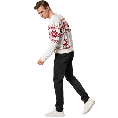 Den tofargede julegenseren Vinterland for herrer med røde motiver på hvit bakgrunn skaper en romantisk stemning. Fin dobbeltstrikk lover høy komfort og behagelig varme. Klesplagget har et klassisk snitt med rund hals og linning som danner en kontrast til det myke ribbestrikkmønsteret. Forsiden og baksiden har typisk nordiske mønstre så vel som to reinsdyr som går mot hverandre, materiale: 100 % akryl.