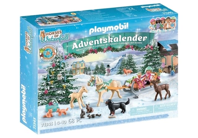 Kjærlig designet Playmobil Adventskalender til Hestene i Waterfall-verdenen med Isabella, hoppa Buttercup, føllet Cream og hunden Lucy, søte skogsdyr, en hesteslede, hodelag, mat og et hestepleiesett. I sleden er det plass til en figur og en hylle til kurven. Trepynten kan oppbevares i gaveesken.