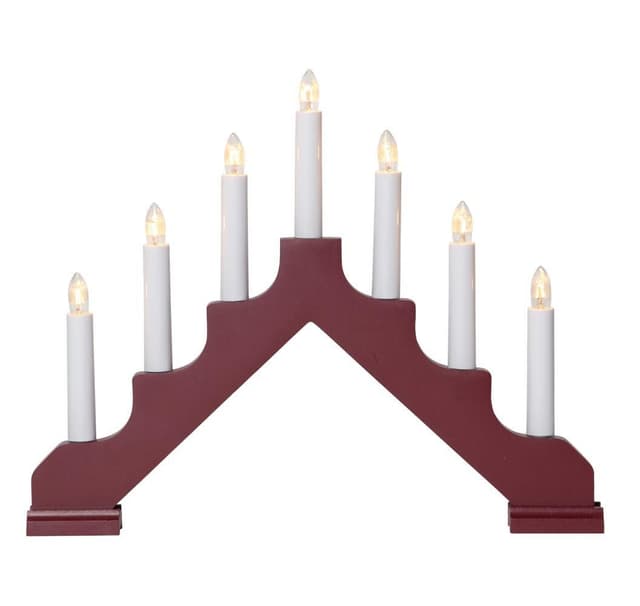 Rød trelysestake med 7 lyskilder. Skaper en koselig adventsfølelse i hjemmet med nydelig glans. Strømkabel 1,8m, med bryter. Lyskilde : pærer 7stk 3W E10, inkludert, utskiftbare. Egnet reservelampe med kode ST304-55. 37xH30cm