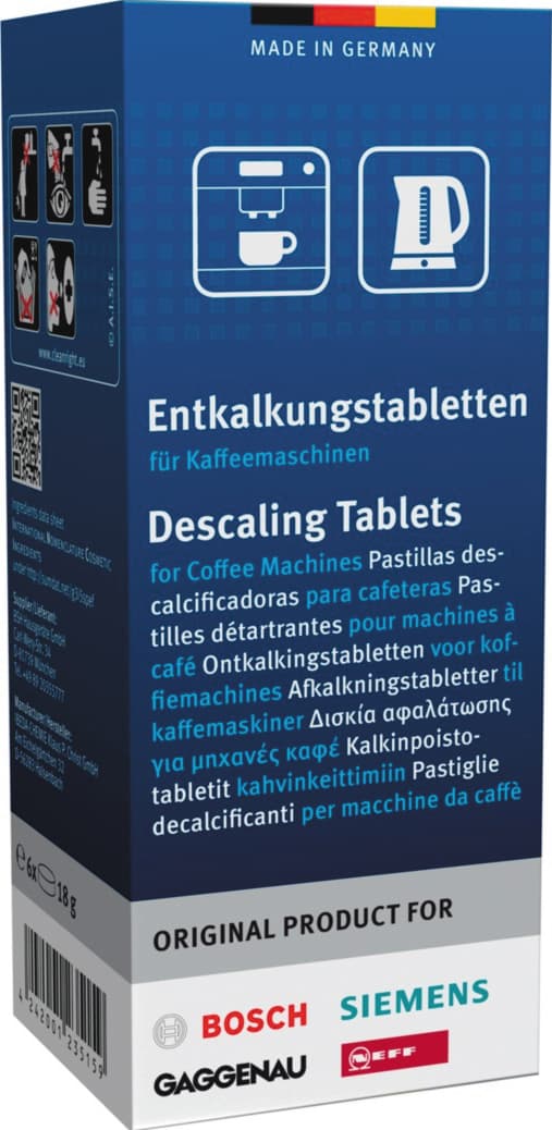 Bosch avkalkningstabletter hjelper deg med å holde din vannkoker, kaffemaskin eller varmtvannsbeholder ren og fri for kalkrester. Pakken inneholder seks avkalkningstabletter som enkelt og effektivt fjerner kalkrester. Bare følg instruksene på pakken og forleng apparatets brukstid.