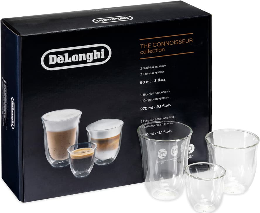 De'Longhi Connoisseur gavepakke med glass DLSC302 inkluderer to espresso, cappuccino, og latte-glass, alle laget av håndblåst borosilikat-glass. De holder dine drikkevarer varme lenger, og er en perfekt gave for enhver kaffeentusiast.Les mer om produktet