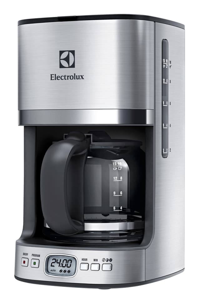 Stilfull kaffetrakter i rustfritt stål fra Electrolux. Kaffetrakteren har flere praktiske funksjoner, inkludert programmerbar timer, flyttbar filterholder med anti-drypp funksjon og varmeplate med slippbelegg. Har en kapasitet på 10 kopper kaffe og vanntanken rommer 1,375 liter. Trakteren har aromakontroll slik at du alltid vil oppnå godt resultat selv om du skal trakte små mengder kaffe. Den skrur seg automatisk av etter 40 minutter dersom du skulle glemme å skru den av. Velg mellom 3 ulike kaffestyrker som vil dekke dine preferanser.