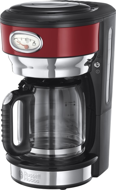 Med kaffetrakteren Russell Hobbs Retro kan du tilberede en kaffekanne full av aromatisk kaffe for en god start på morgenen. Kaffetrakteren er inspirert av en 50-talls retrostil, og har en hendig bryggestaturmåler som gir deg oversikt over bryggeprossessen og den gjenstående hold-varm tiden. Den kommer med en elegant glasskanne med en kapasitet på 1,25 liter, nok til 10 kopper kaffe.