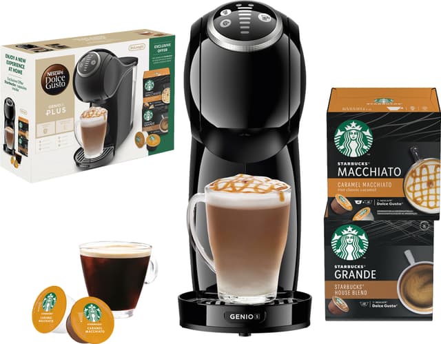 Tilbered dine varme og kalde favorittdrikker medNescafé Dolce Gusto Genio S Plus kapselmaskin. Den har automatisk drift, stilig design, rask oppvarming og kan brukes med mange ulike typer kapsler. Du kan også justere hvor sterk kaffe du vil ha. Starbucks samlepakken inneholder selve kapselmaskinen, en eske med Starbucks Macchiato Caramel-kapsler og en eske med Starbucks Grande-kapsler.
