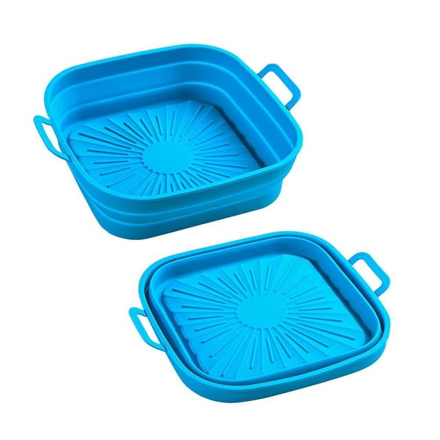 Firkantet form av matgodkjent silikon. Den passer perfekt inn i frityrkokeren og forhindrer klebrige og brente matrester i Air Fryer. Beholderen er gjenbrukbar og maskinvaskbar. Den hevede kanten holder maten på plass og fanger opp smuler og overflødig fett. Formen kan komprimeres slik at den tar mindre plass når den ikke er i bruk.