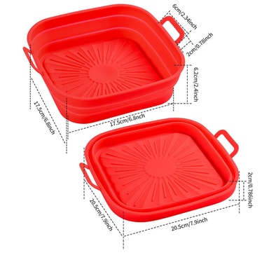 Firkantet form av matgodkjent silikon. Den passer perfekt inn i frityrkokeren og forhindrer klebrige og brente matrester i Air Fryer. Beholderen er gjenbrukbar og maskinvaskbar. Den hevede kanten holder maten på plass og fanger opp smuler og overflødig fett. Formen kan komprimeres slik at den tar mindre plass når den ikke er i bruk.