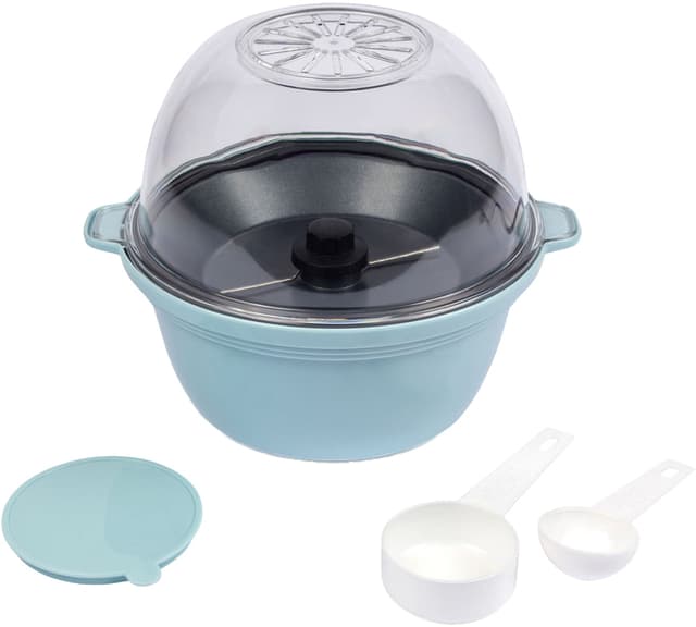 Denne popkornmaskinen har en slitesterk plastramme og et 2-i-1-lokk som også kan brukes som serveringsbolle. Et visningsvindu gjør at du kan følge med på hva som skjer, og non-stick-belegget sørger for enkel rengjøring.