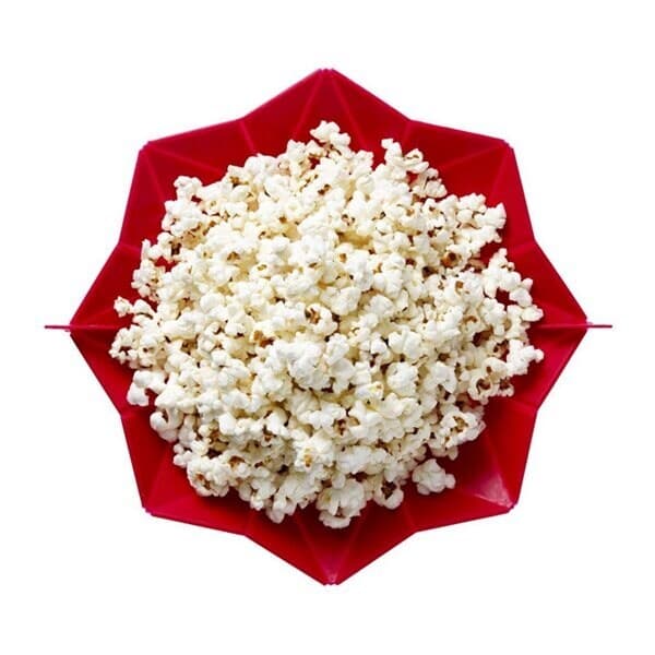 Popcorn Makern er laget av silikon som kan legges sammen sånn at den ikke tar noe plass når den ikke brukes. Når Popcorn Makern er sammenbrettet er den bare 6 cm høy.