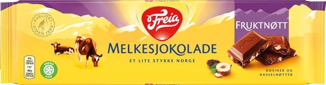 Freia Fruknøtt sjokoladeplate er herlig melkesjokolade med rosiner og hasselnøtter.