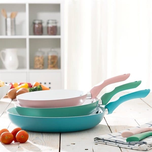 Et komplett sett av kvalitetsstekepanner som gir ditt kjøkken en moderne og original touch med sin fashionable design i pastellfarger. Settet inneholder tre stekepanner av aluminium i ulike størrelser (20-24-28 cm), de har en non-stick flate, keramisk beläegg og ergonomisk mykt håndtak. De har også et hull i håndtaekt som lar deg henge opp dem så at du har dem i nærheten. De kan brukes på gass-, induksjon-, el- og halogentopper.
