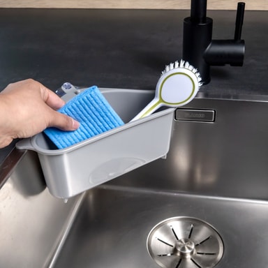 den multifunksjonelle filterkurven kan du oppbevare kjøkkenredskaper som svamper, rengjøringskluter eller til og med oppvask og fruktrester.
