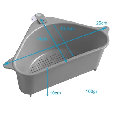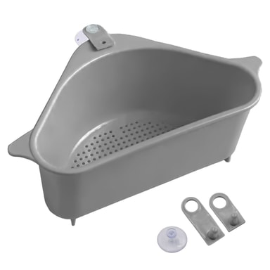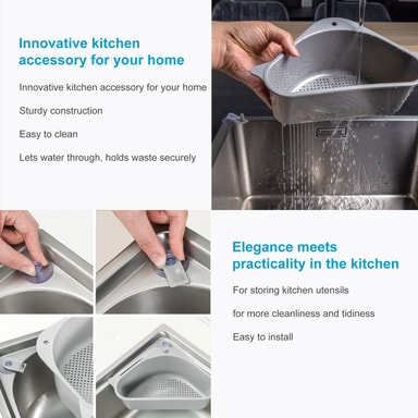rengjøringskluter eller til og med oppvask og fruktrester. Den trekantede formen med ekstra sugekopp og støtteflater gjør at du kan feste filterkurven i hjørnet av vasken din.Silen til vasken er robust, slitesterk, stabil og laget av næringsmiddelgodkjent materiale. Den er enkel å håndtere, plassbesparende, og er perfekt for å vaske frukt eller tappe pasta.