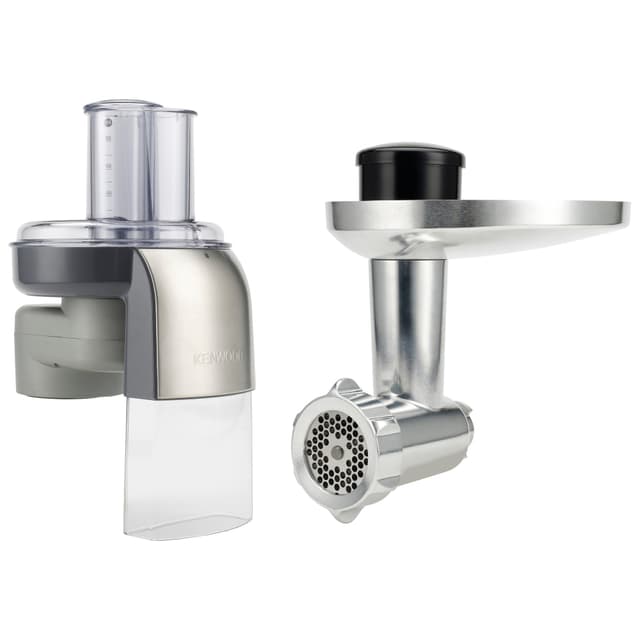 Med den praktiske tilbehørspakken KAM573ME til din kjøkkenmaskin fra Kenwood er det lett å kverne kjøtt eller kutte ost og grønnsaker.