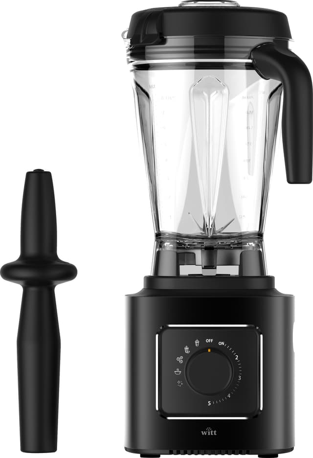 Witt Premium Power Blender har et solid og elegant utseende. Med et nordisk design med en mattert underdel i sort aluminium og et lysende kontrollpanel, er denne blenderen vanskelig å ignorere. Blenderen kommer også med 5 hastighetsnivåer, en iskrem-pinne, stålblader i rustfritt stål og et låsesystem.