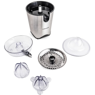 Silen i rostfritt stål är avtagbar och kan rengöras i diskmaskinen tillsammans med presskoner, juiceuppsamlare och dammskydd. Färskpressad juice bör inte saknas på något frukostbord.