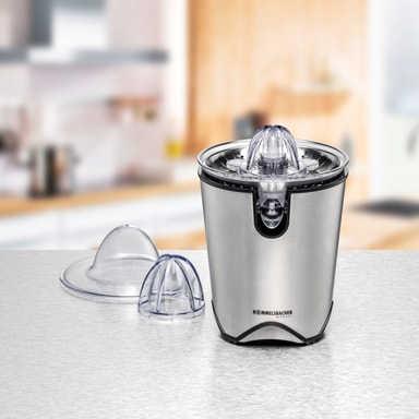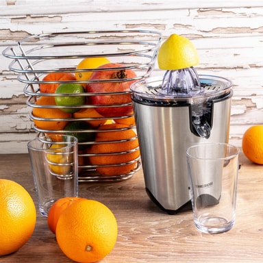 Det råder ingen tvekan om att färskpressade juicer smakar bäst. Med denna eleganta citruspress av högkvalitativt rostfritt stål kan du pressa saften till den sista droppen apelsiner, citroner och grapefrukter på nolltid, tack vare de två olika juicekonerna. Ett litet tryck är tillräckligt och den kraftfulla motorn kommer att sörja för resten. Saften rinner direkt ner i ett glas med en vikbar pip.