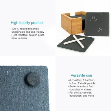 Coaster i 11 deler. Med krittstreker for merking. Svart naturskiferstein, 10 x 10 cm.Les mer om produktet
