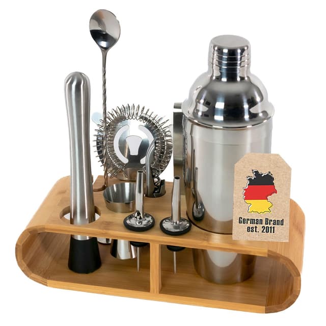 Intirilife 12-delt cocktailshakersett med bambusstativMed det stilige shakersettet kan du trylle frem imponerende drinker til venner og familie. På grunn av det praktiske og estetiske arrangementet til bambusstativet slipper du rot i skuffer og skap på en ekstremt stilig måte. Et blikkfang for ethvert kjøkken eller bar! Verktøyet av høy kvalitet er egnet for hjemme, utendørs, fester og barer, enten det er amatør eller profesjonell. Dette gjør den til den perfekte gaven for cocktailelskere Shakeren laget av rustfritt stål rommer 750 ml.