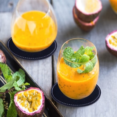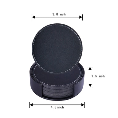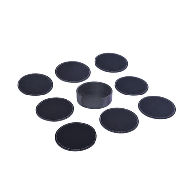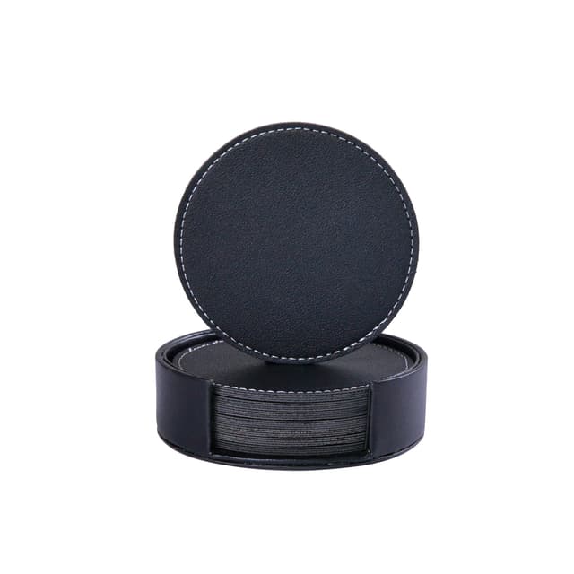 De 8 glassunderlagene som kommer i oppbevaringsboksen er laget av slitesterkt PVC-skinn med fine sømmer på sidene. Underlagene beskytter effektivt bordet mot skader og flekker.