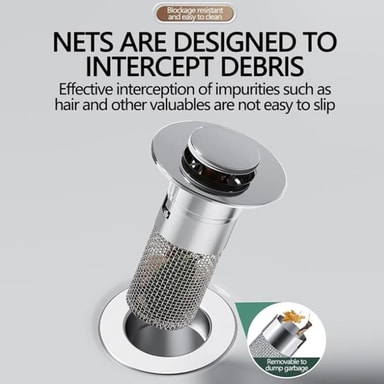 Pop-Up Design: Pop-up-avløpsfilteret for servant inkluderer en antiblokkeringskurv som kombinerer en stopper og et filter. Det kan lagre vann og forhindre at hår og verdisaker som smykkeringer havner i avløpet. Den avtakbare utvidede kurven gir ekstra plass til å samle rusk, noe som gjør rengjøringen enda enklere
