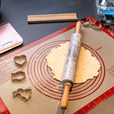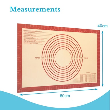 Matten har størrelsesinformasjon på overflaten for lengde og diameter. Dette sparer deg for bryet med å måle ved utkjevling av deig og lignende.