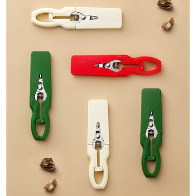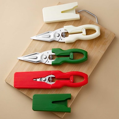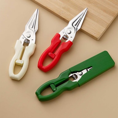 Safe Locking: Med en innebygd låsemekanisme sikrer disse kjøkkensaksene trygg oppbevaring og forhindrer utilsiktede kutt når de ikke er i bruk. Låsen holder bladene sikkert sammen, noe som gjør dem trygge å oppbevare i skuffer eller redskapsholdere uten fare for skade. Denne sikkerhetsfunksjonen er spesielt viktig for husholdninger med barn eller kjæledyr. Den brukervennlige utformingen gir enkel låsing og opplåsing, noe som gir trygghet og forhindrer uhell under daglig bruk på kjøkkenet, og den er perfekt for sikker håndtering og oppbevaring.