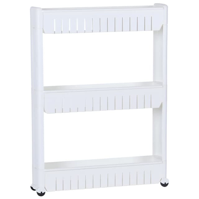 Kopplingsbar og rullbar, nisjehyllen i tre etasjer er utmerket for å sortere en rekke redskaper på en plassbesparende måte og alltid ha dem for hånden. Ved bruk kan vognen brukes fleksibelt på alle tenkelige steder. Enten på kjøkkenet, badet, stuen eller ved skrivebordet kan du oppbevare de viktigste tingene dine hvor som helst, som husholdningsartikler, krydder, kjøkkenutstyr, kontorrekvisita eller baderomsartikler. Det hvite oppbevaringsstativet er enkelt å rengjøre og enkel å bruke Håndtering. Monteringen er rask og enkel og den kan også flyttes uanstrengt. Ikke bare får du mye plass på liten plass, vognen kan også brukes som serverings-, te- eller barvogn Materiale og mål: plast, 54 x 12 x 71 cm