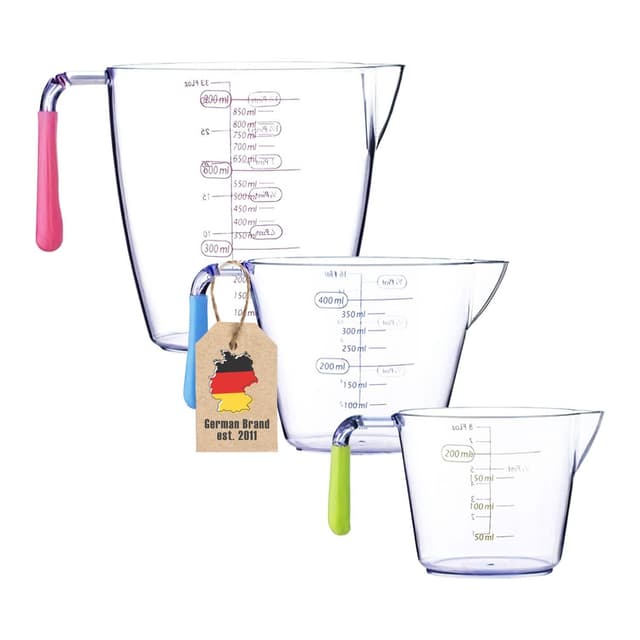 Målekoppsettet er ideelt for hverdagsliv, kjøkken, camping , reiser, catering og kantiner. Koppene er gjennomsiktige og har helletut for nøyaktig måling og fylling, og håndtakene er også dekket med forskjellig farget silikon.Lett vekt, varmebestandighet og et sklisikkert håndtak gjør arbeidet med settet enkelt. De er også lette å vaske og egner seg til oppvaskmaskin og mikrobølgeovn. Det er en metrisk skala på siden som tillater presis måling, så målekoppene egner seg ikke bare til matlaging, men også til baking, miksing av drikke