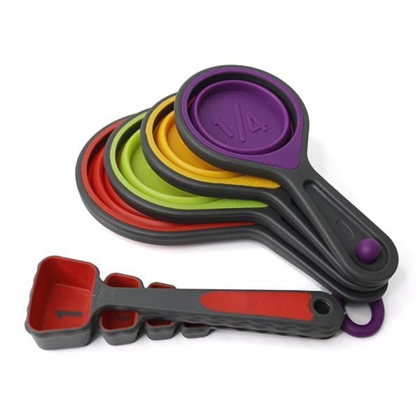 De større måleskjeene kan foldes sammen når de ikke brukes og de mindre måleskjeene er designet slik at de kan ligge under hverandre uten å ta plass.
