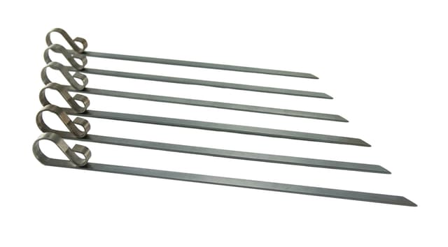 Rustfritt stål, flate spyd. Seks stk. Flat slik at du unngår maten som snorker rundt spydene dine mens du griller og snu dem. Rustfritt stål slik at de kan tåle oppvaskmaskin.