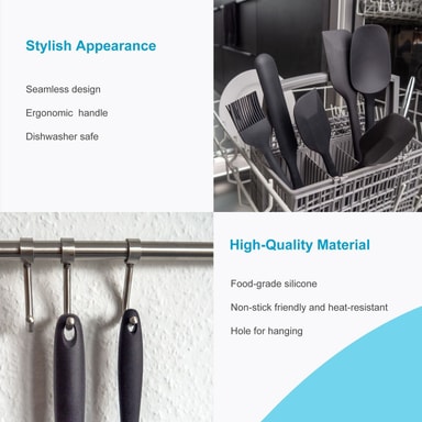 Det robuste kjøkkenredskapssettet er enkelt å rengjøre takket være det non-stick silikonbelegget og tåler oppvaskmaskin.