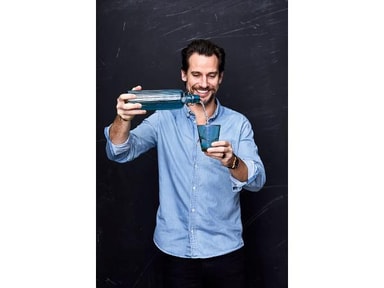 Flott vannflaske i resirkulert glass, med et fint og rustikt uttrykk. Flaskens patentkork har en keramikkpropp med blank, reaktiv glasur i blå som passer til glassets farge. Når du kjøper flasken, støtter du samtidig utsatte barn i malawi.