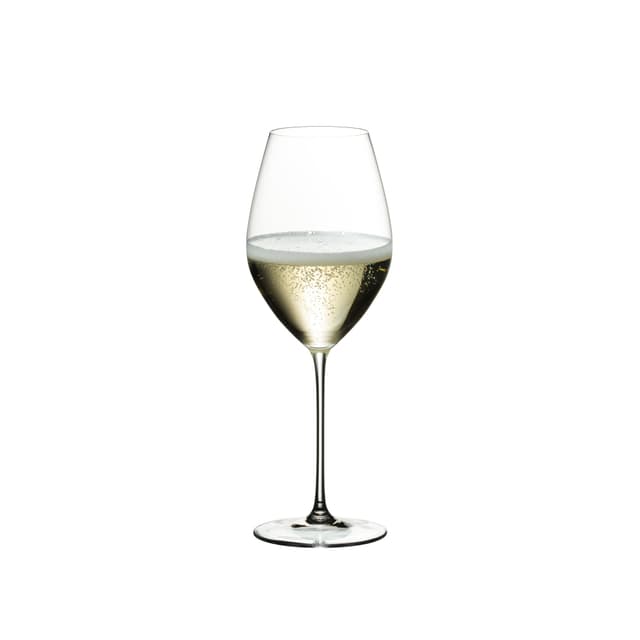 Riedels champagneglass skiller seg fra andre druespesifikke glass, ettersom champagne i henhold til tradisjonen lages av mer enn én drue. Glasset fremhever en bestemt drikk og ikke en bestemt drue. Klokken er spiss nederst, noe som gjør at en strøm av bobler bygges opp inni glasset, nesten som en pilar. Denne formasjonen er ikke bare vakker å se på, men den sørger også for at champagnens «liv» forlenges. Klokkens brede midtparti løfter aromaene i drikken, og den avsmalnende åpningen konsentrerer i sin tur duften til nesen. Åpningen styrer også drikken til tungens fremre del, som hever opplevelsen av sødme.