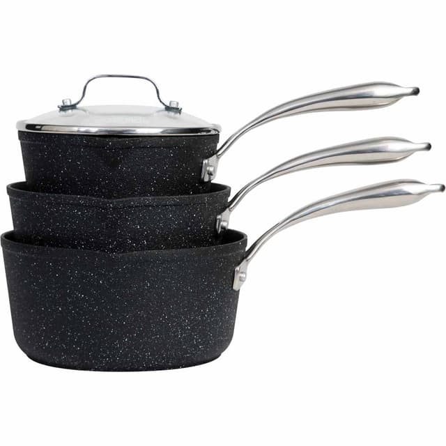 EAZiGLIDE 3-delt grytesett 1,4 l 2,0 l 2,8 lLivstidsgaranti for at overflatebelegget ikke flasser• 3 lag belegg• 3,5 mm aluminiumshusNittet håndtak i rustfritt stål, er kult under bruk• Stekeovn opptil 260 ° C• Fungerer på alle varmekilder