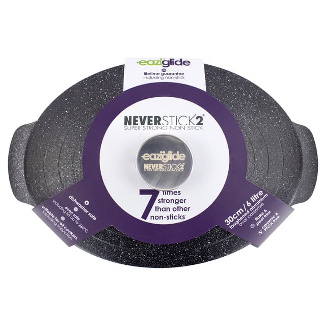 Eaziglide Oval gryte 30 cm, 6 LiterLivstidsgaranti for at overflatebelegget ikke flasser• 3-lags belegg• 3,5 mm aluminiumskropp• Håndtak i rustfritt stål, svalt under bruk• Stekeovn opptil 260 ° C• Fungerer på alle varmekilder