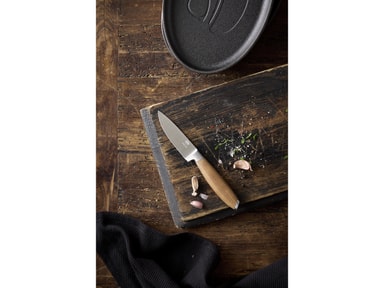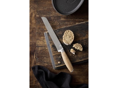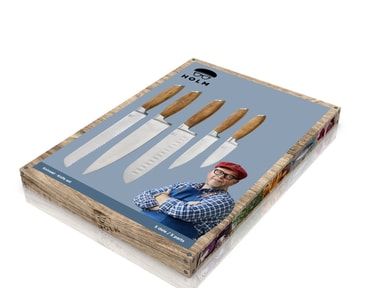 Knivsettet inneholder fem flotte kniver – urtekniv (20 cm), universalkniv (24 cm), santokukniv (31 cm), kokkekniv (33 cm) og brødkniv (33 cm). De vakkert avrundede skaftene ligger godt i hånden og er laget av akasietre med virkelig vakre og karakteristiske årringer, avsluttet med en elegant stålkappe i enden av skaftet. Bladene er laget av rustfritt stål i høy kvalitet. Knivene bør vaskes for hånd med varmt vann og såpe – også før første gangs bruk. Tredelen av varen er FSC®-sertifisert akasie (FSC-C166612).