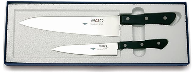 MAC-knivenes høye kvalitet kommer fra en blanding av det beste fra japansk og vestens tradisjoner innenfor knivproduksjon. Hver MAC-kniv er håndslipt av profesjonelle smeder fra det berømte SEKI-området, som er Japans sverdsentrum. SEKI er kjent for mer enn 700 års tradisjon med knivproduksjon. DAMASK SERIEN Kjernen i knivene er laget av høy-karbon, krom, vanadium Mac stål med en HRC på 62 og kan slipes meget skarp. Smidd med 32 lag av rustfritt stål på hver side av kjernestålet. De 64 lag har som funksjon å beskytte mot syreholdige matvare, og samtidig får kniven et nydelig utseende. Skaftet er noe ovalt og fremstilt av Micartatre