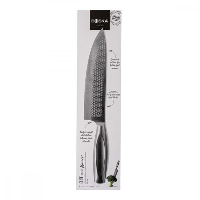 Oppdag den ultimate kniven for kokken, nemlig Kokkekniv Monaco+! Denne kokekniven er en ekte allrounder og essensiell på alle kjøkken. Den slanke bolsteren gir deg full kontroll over kniven, slik at du uanstrengt kan skjære kjøtt, fisk og grønnsaker. Rustfritt stål Kokekniven er laget av høykvalitets rustfritt stål. Dette holder kniven skarp i lang tid, lar den takle hard mat og gjør den enkel å vedlikeholde og slipe. Kokkekniven har et flott diamantmønster for å få mindre motstand når du bruker den. Laget for å vare lenge Vask kjøkkenknivene for hånd etter bruk. Litt varmt såpevann er alt du trenger. Ikke glem å tørke kjøkkenknivene umiddelbart etter vask. Om BOSKA BOSKA lager ""Food Tools for Life"" og mener at kvalitet er bærekraft. Målet deres er å designe produkter som varer hele livet. Det hele begynte i nærheten av Gouda, i Holland, hvor smeden Willem Bos lagde sine første osteredskaper for de lokale bøndene. Fra den dagen har det vært en familientradisjon å lage morsomme og smarte redskaper slik at du kan nyte ost, sjokolade, pizza og mer. Så enten du skjærer, river, griller eller smelter, hjelper BOSKA deg med å lage appetittvekkende mat og en fest på bordet ditt. Vel bekomme!
