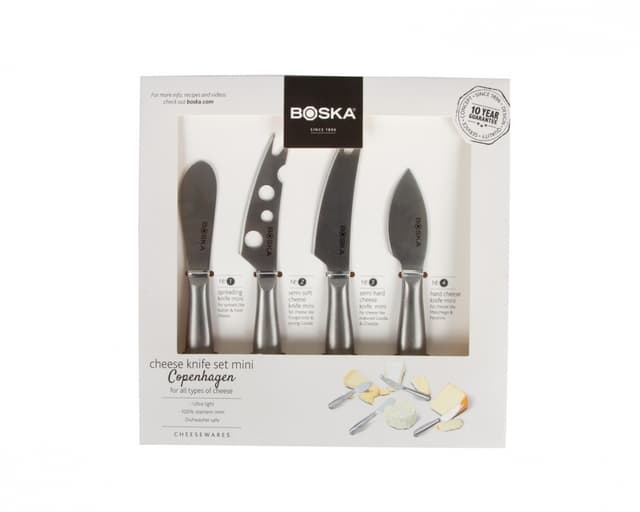 Er du også bare helt gal etter ost? Da trenger du Osteknivsettet Mini Copenhagen! Du kan takle harde, myke og smørbare oster. Den består av fire stilige kniver i rustfritt stål og du kan derfor lage noe for alle på ostebrettet ditt. Drømmelaget Har du lyst på en myk eller halvhard ost? Cheese Knife Cheesy Mini vil få jobben gjort. Men du kan også kutte opp harde til veldig harde oster. Bruk i så fall på Hard Cheese Knife Mini. La oss ikke glemme pålegg og andre oster. Presentation Knife Mini og Spreading Knife Mini avrunder dette drømmeteamet. Lette ostekniver Håndtakene på disse osteknivene er hule på innsiden, noe som gjør dem lette. Knivene i rustfritt stål vil vare lenge. De kommer med 10 års garanti. På tide å vaske opp? Ikke noe problem! Settet kan gå rett i oppvaskmaskinen og kommer ut som nytt! En gave til ham eller henne Leter du etter en original julegave? Eller en gave til farsdagen, morsdagen, et bryllup, en bursdag eller Valentinsdagen? Da trenger du ikke lete lenger! Osteknivsettet Mini Copenhagen er den perfekte gaven til både menn og kvinner. Og mye finere enn et standard gavekort. Bare sett en sløyfe på toppen og du er ferdig. Om BOSKA BOSKA lager ""Food Tools for Life"" og mener at kvalitet er bærekraft. Målet deres er å designe produkter som varer hele livet. Det hele begynte i nærheten av Gouda, i Holland, hvor smeden Willem Bos lagde sine første osteredskaper for de lokale bøndene. Fra den dagen har det vært en familientradisjon å lage morsomme og smarte redskaper slik at du kan nyte ost, sjokolade, pizza og mer. Så enten du skjærer, river, griller eller smelter, hjelper BOSKA deg med å lage appetittvekkende mat og en fest på bordet ditt. Vel bekomme!