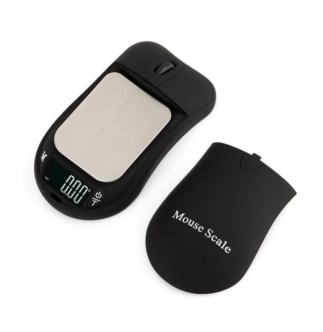 Minivekt i morsomt design: Når den digitale vekten er lukket, ser den ut som en vanlig datamus! Den har tarafunksjon og automatisk avstenging. Med overbelastningsindikator og en presisjon på 0,01 g.