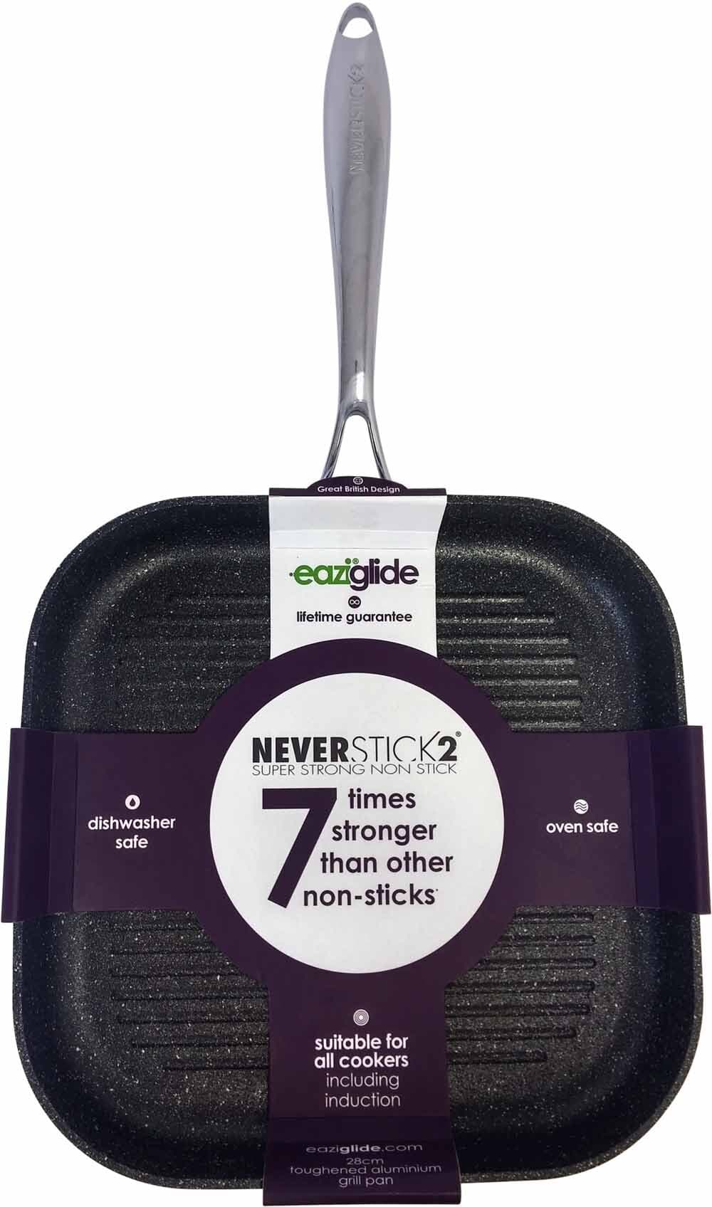 Eaziglide Grillpanne 28 cmLivstidsgaranti for at overflatebelegget ikke flasser• 3 lag belegg• 3,5 mm aluminiumskropp• Håndtak i rustfritt stål, er avkjølt under bruk• Stekeovn opptil 260 °C• Fungerer på alle varmekilderLes mer om produktet
